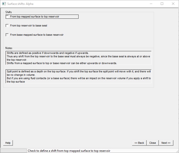 Check to define a shift from top mapped surface to base seal. You use this if you have a "thief zone" at the top of the reservoir. It is exactly equivalent to moving the spill point up by the thickness of (shift to) the thief zone. |