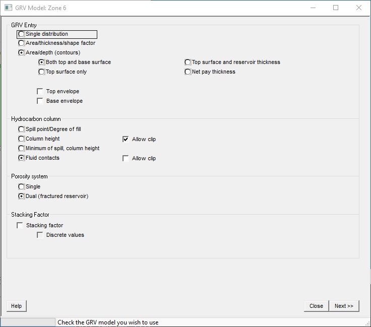 There are three methods for entering gross rock volume (GRV): as a single distribution, as the product of area, thickness and shape factor and from area/depth (contour maps) (you can also enter GRV/depth data or net pay maps).