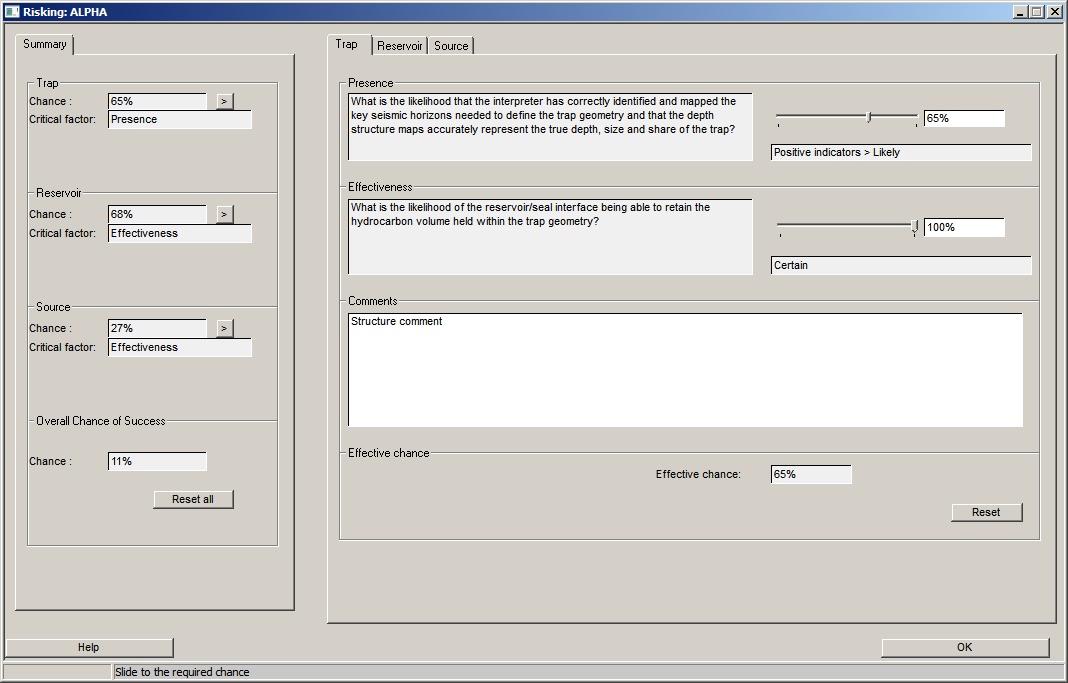 Prospect chance is divided into three categories: Trap, Reservoir and Source.